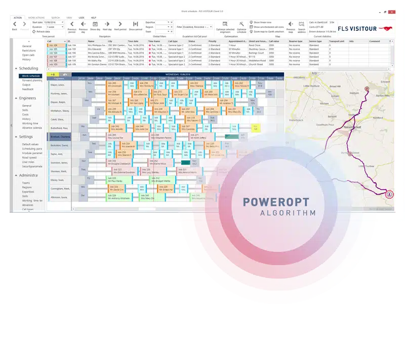 - Features of FLS VISITOUR including the PowerOpt algorithm feeding real-time route planning